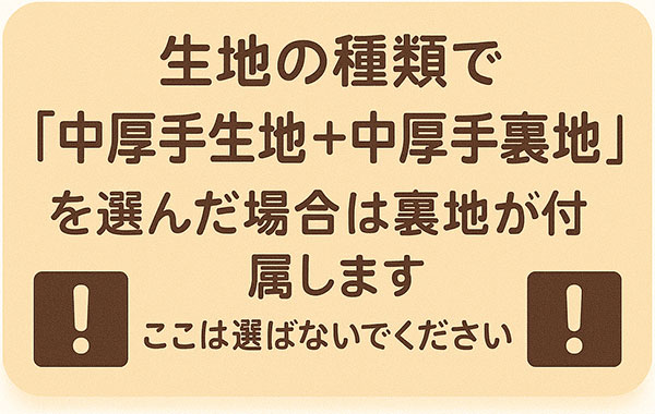 | 裏地の有無 | キルティング生地の場合:無し/中厚手生地の場合:有り |