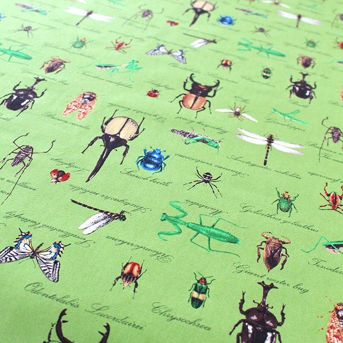 野原みたいなグリーンの生地に、たくさんの虫たちが描かれたにぎやかなデザインです。