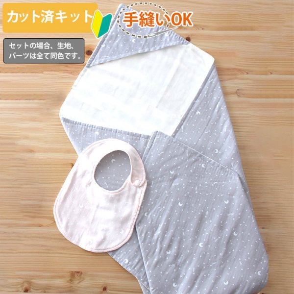 星と月【国産おくるみと丸型スタイセット】ベビー 手作りキット 作り方マニュアル付き ダブルガーゼ フード付き [hoshitsukiBsetAL]