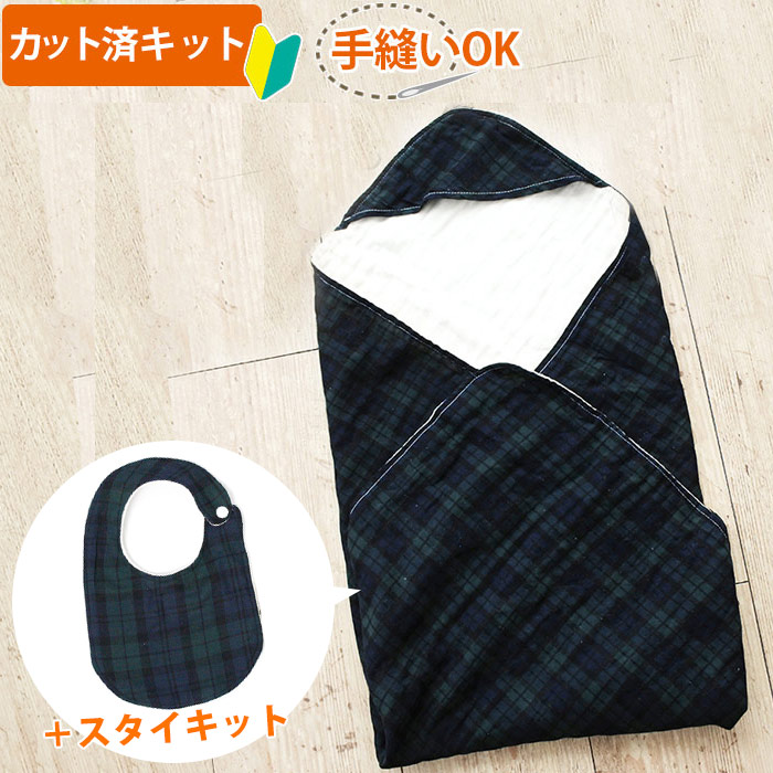 - > ブラックウォッチ【国産おくるみと丸型スタイセット】ベビー 手作りキット 作り方マニュアル付き ダブルガーゼ フード付き