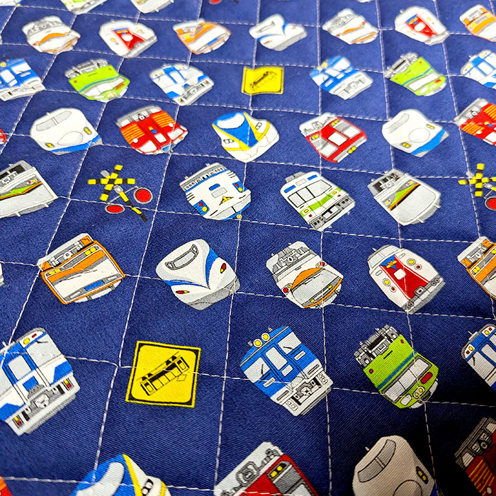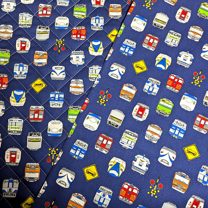 キリッとしまったネイビー地の生地に、電車のお顔がずらっと並ぶカッコいい生地です。