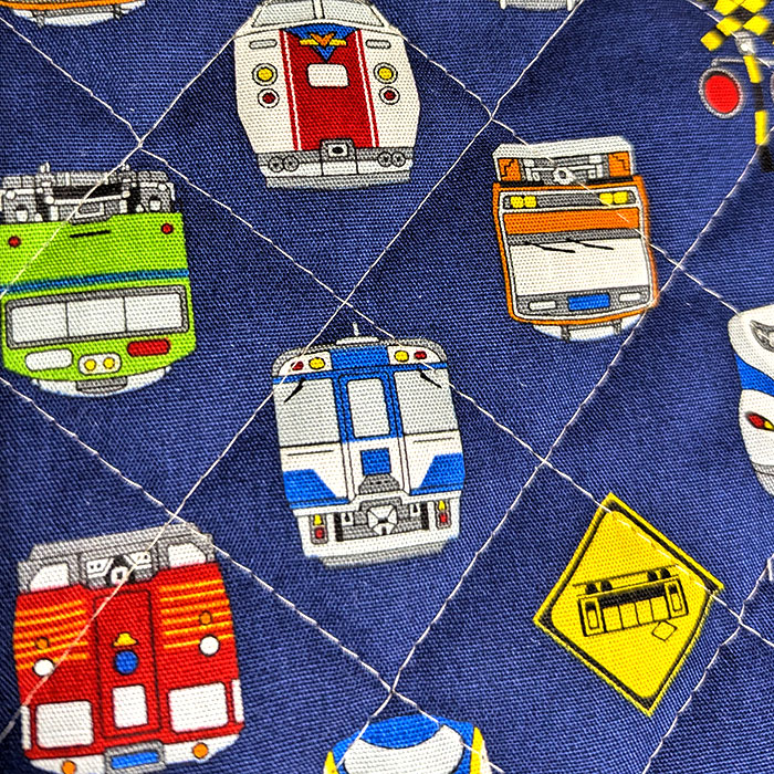 キリッとしまった紺の生地に電車が並びます