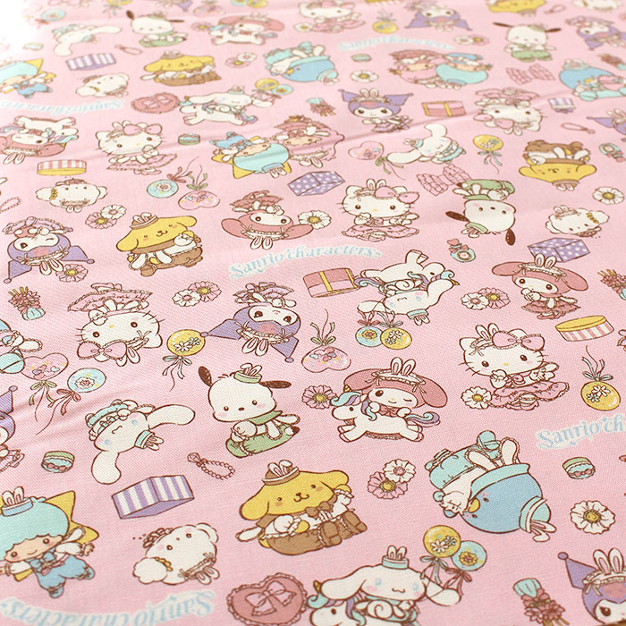 やさしいピンクに、サンリオキャラクターたちがぎゅっと詰まった夢かわ生地。