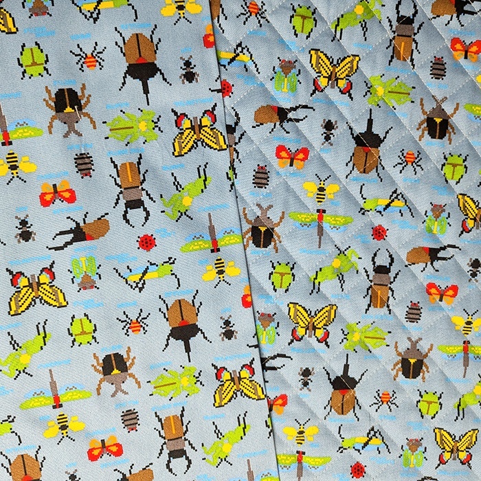 カブトムシや蟻、ちょうちょなどおなじみの虫たちがレトロゲーム風のピクセルドットで描かれている遊び心あふれる生地です。