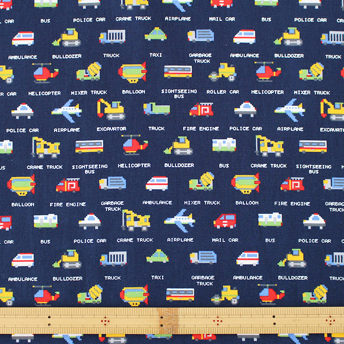 陸海空のかっこいい乗り物たちをちょっと可愛いドット絵で描いたキュートな生地です。