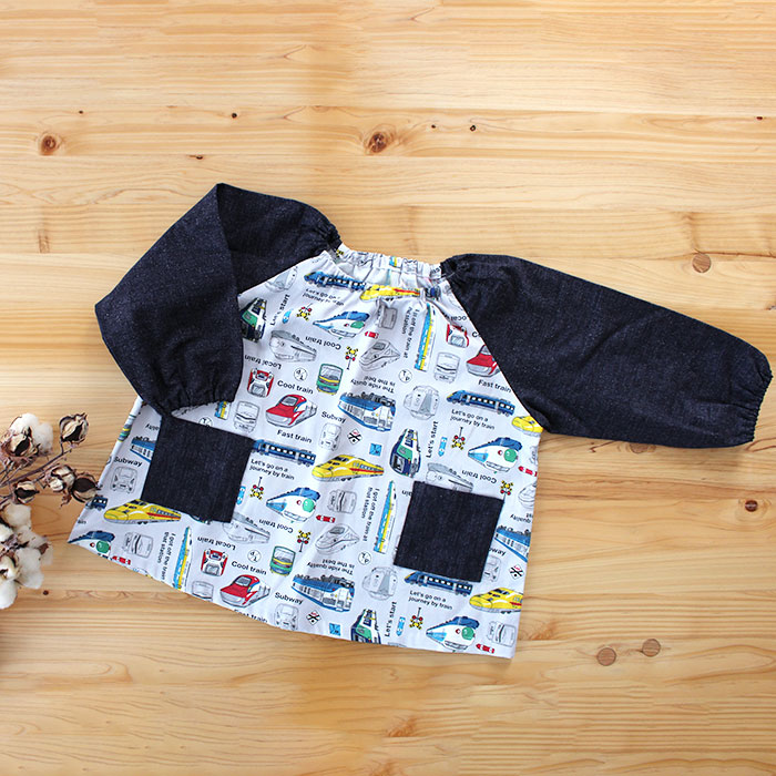 電車と新幹線 ライトグレー【スモック】 手作りキット 作り方マニュアル付き 中厚手生地