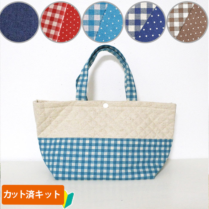 - > リネンと選べるチェック&ドット◎底布付【ランチバッグ/トートバッグ】手作りキット 作り方マニュアル付き 入園入学 手芸キット キルティング【L】