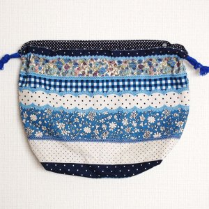 小花のボーダー ブルー【お弁当袋】手作りキット 作り方マニュアル付き 入園入学 2026年度春 薄手生地+裏地[u]