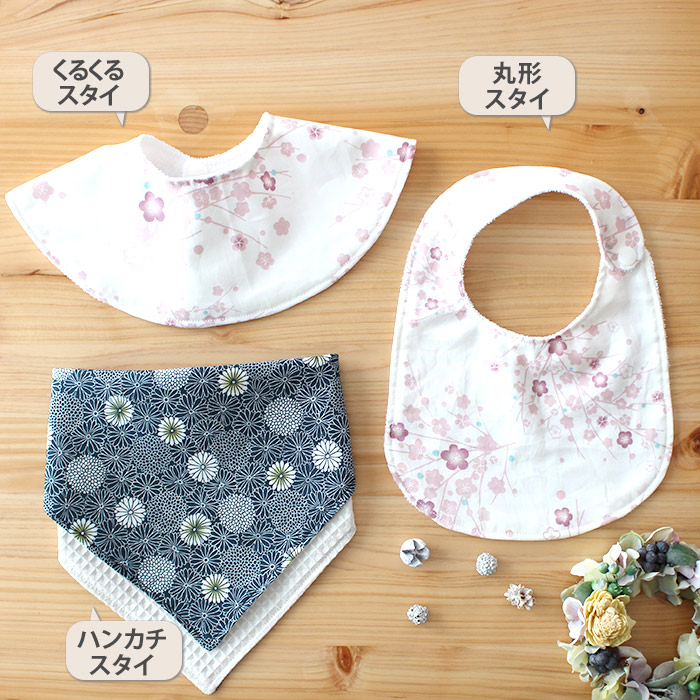 梅とキク【丸型スタイ】【くるくるスタイ】【ハンカチスタイ】ベビー 材料セット 作り方マニュアル付き ダブルガーゼ 国産