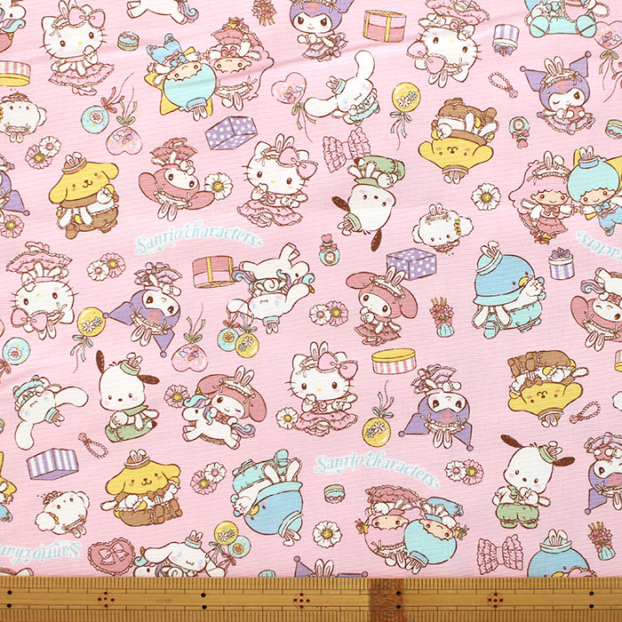 やさしいピンクに、サンリオキャラクターたちがぎゅっと詰まった夢かわ生地。