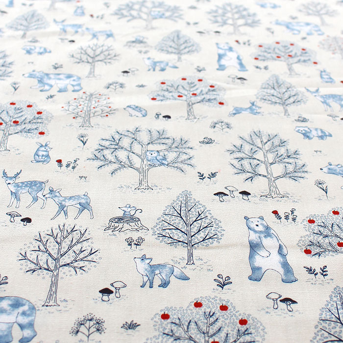 りんごとキノコの森に動物がいっぱい!くま、うさぎ、アライグマ、鹿、ハリネズミなどの可愛い野生動物が勢揃い。森に迷い込んだみたいなメルヘン感あふれるとってもキュートな生地ですよ♪キナリがベースのナチュラルな仕上がりなので、汚れ防止のためにレッスンバッグ、シューズバッグ、体操服袋(ナップサック)にはパーツと同系色の底布が付属します。